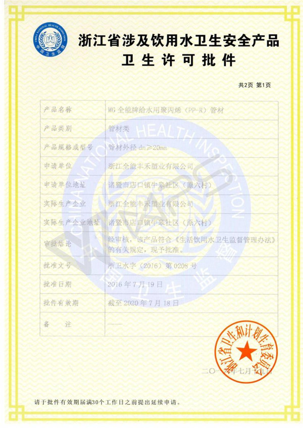 浙江省涉及饮用水卫生安全产品卫生许可批件